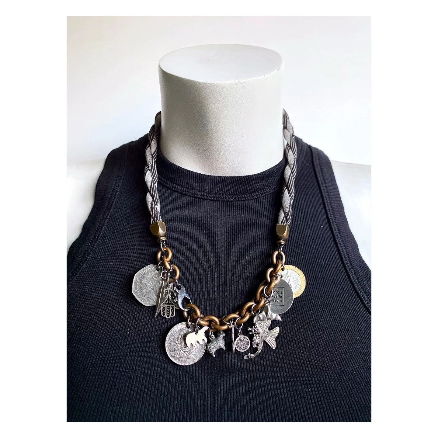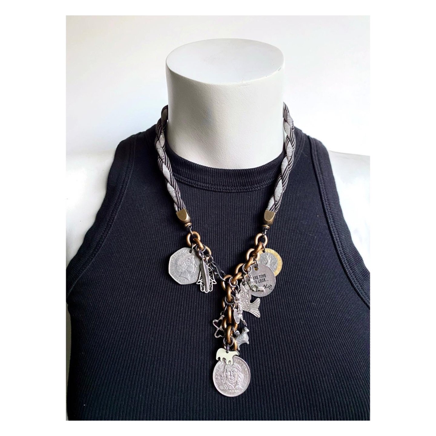 Have a collection of charms or family heirlooms? We made this custom piece for an 18 year olds birthday. Her mom had been saving these charms and coins since her birth. We love how it turned out and can’t wait to make more. Get in touch if this inspires…many design options are available.